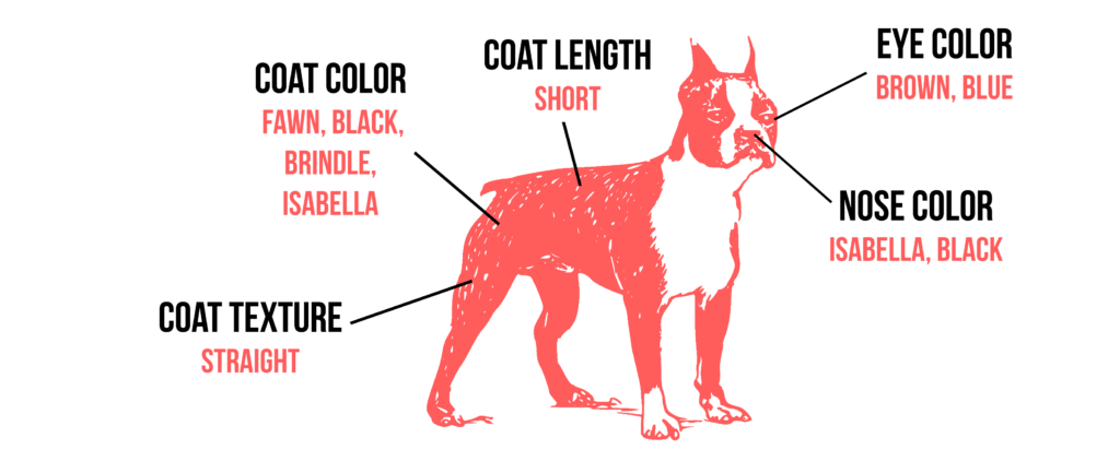 They have a lovable, wrinkle-free mug with a square jaw line and upright ears that are sometimes cropped. The nose is black and the eyes are set wide apart and are large, round, and dark in color. They should never have any trace of blue. The chest is deep and the body should appear short.