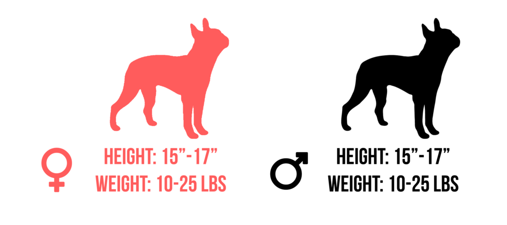 Both male and female Boston terriers are 15 to 17 inches tall and weigh between 10 and 25 pounds.