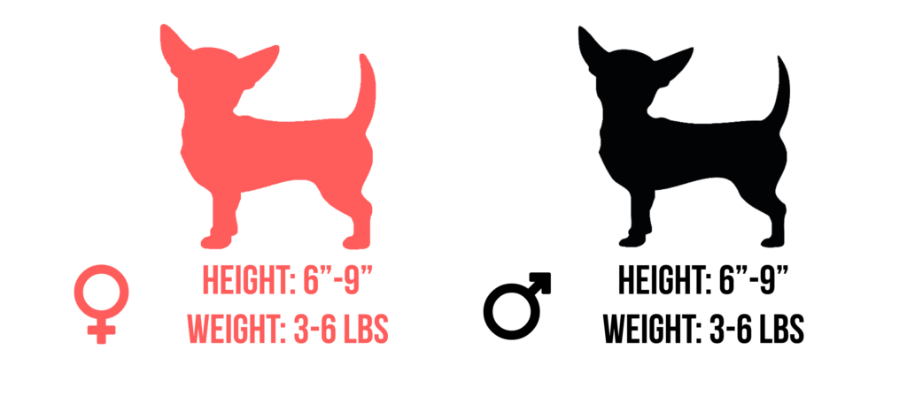 Most Chihuahuas will weigh between 3 and 6 pounds. Some can be smaller but usually have more health complications. Others can be larger and weigh up to 12 pounds, these larger Chihuahuas are great for families with children. They usually only stand about 6 to 9 inches at their shoulder making them the smallest breed. There are occasional outliers that grow between 12 to 15 inches tall. Even puppies from the same litter can have drastically different heights and weights.