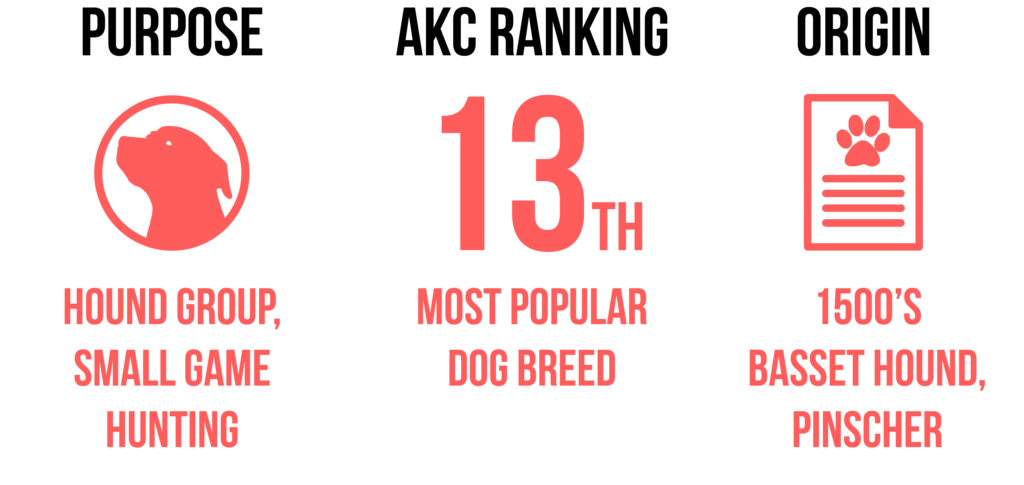 Dachshunds are a German-bred dog that originally dates back to around the 15th century with illustrations that appear to depict this dog breed. There are other known documents using nicknames such as “badger creeper,” “earth dog,” “badger crawler,” and “badger catcher.” Badger Creeper is an obvious variation of the meaning of their name “badger (Dachs) dog (hund).” Badgers and other tunneling creatures were problematic, and in some areas still are. Dachshunds were the solution to this great vermin problem. The size of a Dachshund varied greatly, and their size and weight normally determined their hunting game. Dachshunds on the larger side (30 to 35 pounds) were used to burrow and hunt badgers and boars, while smaller Dachshunds (16-30 pounds) were used to hunt foxes and small deer. Smaller Dachshunds were used to hunt hares, weasels, and cottontails.