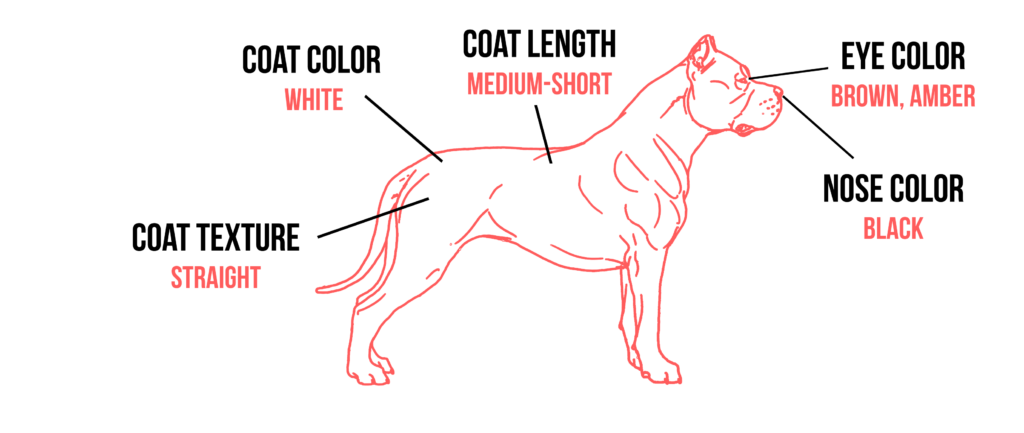 The most distinct physical feature that makes the Argentine Mastiff very recognizable is his white coat with one small black marking on his head. They have a very muscular body that is seen under his close-fitting skin. Their coat may be anywhere from 1/2 to 3/4 inch long. The thickness of their coats depends on the climate in which they live. Dogos in warmer, humid climates have a thinner coat in which you may even see their skin. Whereas Dogos in colder climates will have thicker coats and can even present a double coat. Many have their ears cropped but it is not necessary to do this. He is a very well-proportioned, strong breed with forelegs and hind legs reaching the same length.