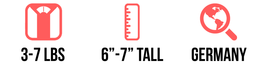 He is a toy breed and stands only 6 to inches tall and will weigh 3 to 7 pounds. Occasionally a litter will have a larger dog like the old days that might grow up to be 12 to 14 pounds.