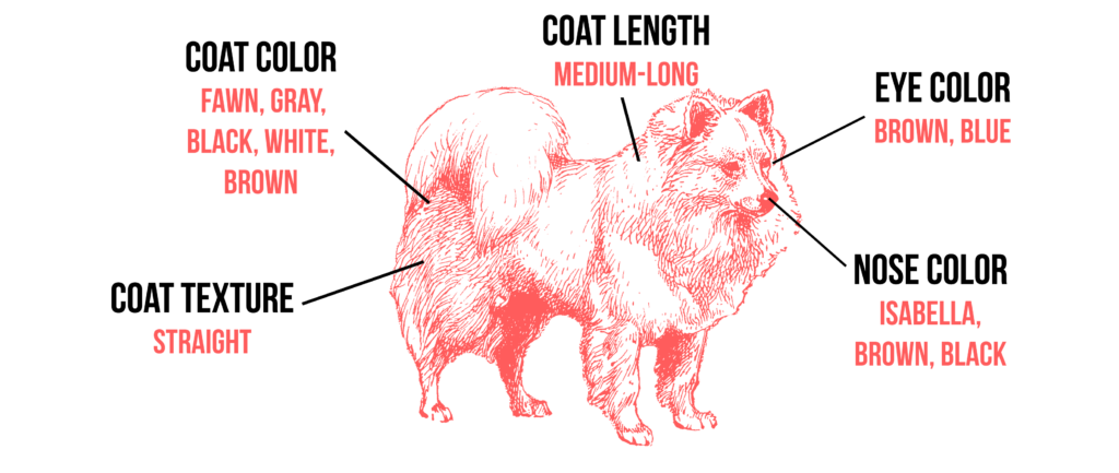 He is a compact toy breed that has a short back with well-proportioned legs and body. The general head shape is wedge-like looking a little fox-like. Poms have a dense soft undercoat then a longer outer coat that has a harsher texture. Their coat can be a variety of colors including black, white, brown, red, cinnamon, cream, blue, sable, tan, and orange. Their coats can be two colors, common combinations are tan and black, cream and red, more recently a merled coat is also a possibility.