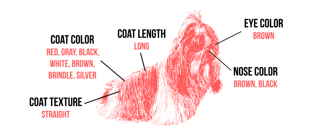 Shih Tzus that have a white blaze on the forehead and a white tip on the tail are very valuable. They have a long and silky coat that comes in various colors: gray and white, black and white, red and white, or just plain black. However, it takes a lot of work to keep a Shih Tzu’s coat looking great.