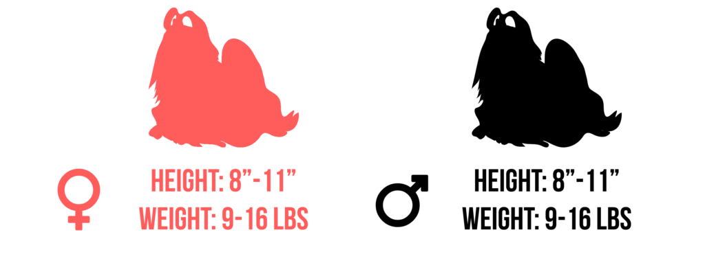There is no strong distinction between male and female Shih Tzus when it comes to size. Both genders stand between 9 and 10 1/2 inches tall and both weight between 9 and 16 pounds total.